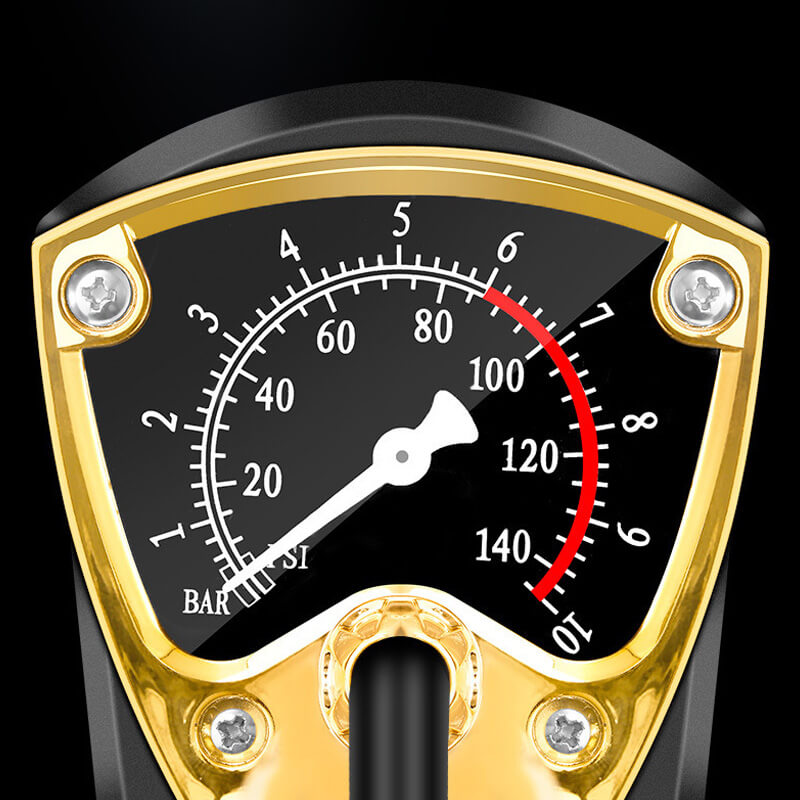 Łatwe monitorowanie ciśnienia powietrza za pomocą manometru o wysokiej dokładności (2 jednostki odczytu: PSI/BAR), który zapobiega nadmiernemu pompowaniu.