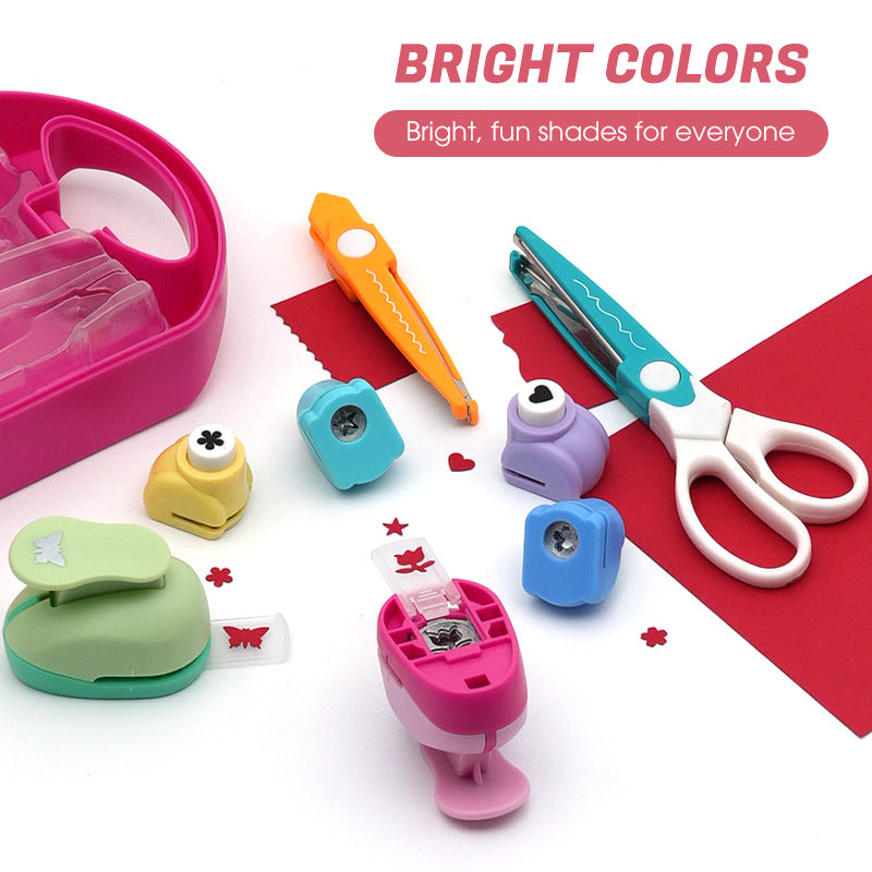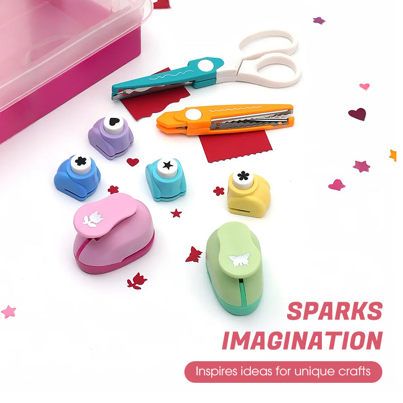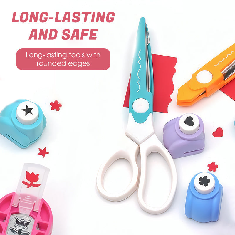 Zestaw kreatywnych wykrojników- Zestaw zawiera różnorodne wykrojniki o fantazyjnych kształtach, takich jak serca, gwiazdki i kwiaty, a także nożyczki z falistymi ostrzami. Nadaje się do papieru, kartonu, a nawet lekkich tkanin. Twórz wyjątkowe projekty kartek okolicznościowych, dzienników, opakowań na prezenty lub innych projektów DIY. Dzięki wielu kształtom, które można dowolnie łączyć, każdy element wyróżnia się wyjątkowością, otwierając nieograniczone możliwości twórcze.