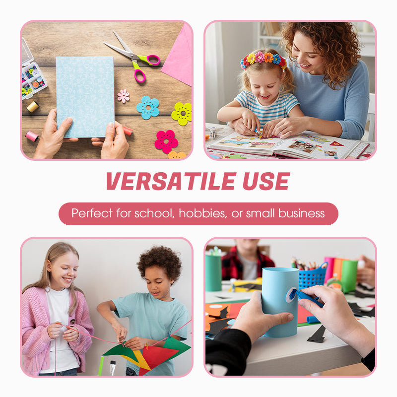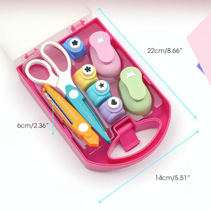 Żywe kolory i uporządkowane przechowywanie- Narzędzia mają jasne odcienie różu, niebieskiego, żółtego i zielonego, co sprawia, że są atrakcyjne dla dzieci, a jednocześnie odpowiednie dla nastolatków i dorosłych. Wszystkie narzędzia można schludnie przechowywać w kompaktowym etui, dzięki czemu dziurkacze i nożyczki są uporządkowane i łatwe do przenoszenia. Niezależnie od tego, czy chodzi o spotkania rzemieślnicze, warsztaty czy inne okazje, można je łatwo przenosić bez obawy o zgubienie części.