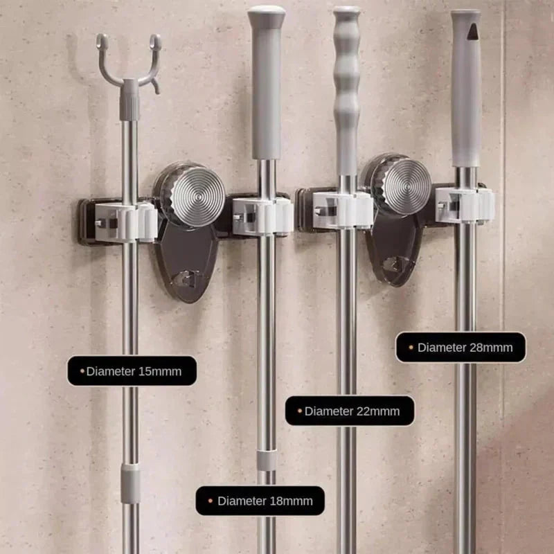 MAKSYMALNY KOMFORT: Głowica z przyssawką może być obracana pod dowolnym kątem, dzięki czemu można ją umieścić w dowolnym rogu lub nietypowym miejscu, a uchwyt na miotłę i mop zamontowany na ścianie jest łatwo dostępny.