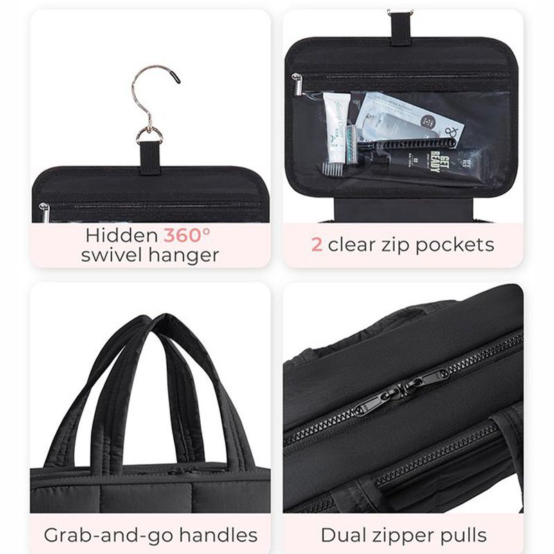 PRZEMYŚLANA KONSTRUKCJA: Elastyczne paski mogą utrzymać butelki o różnej wysokości w pozycji pionowej. Można w nim umieścić grzebień, szczoteczkę do zębów, maszynkę do golenia i podatny na wycieki makijaż, a nawet suszarkę do włosów. Metalowy hak 360° zapewnia różne opcje zawieszenia;