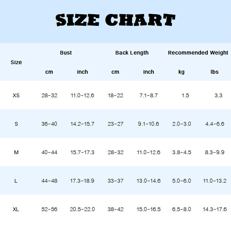 Przy wyborze rozmiaru należy kierować się przede wszystkim obwodem klatki piersiowej i długością grzbietu, zwłaszcza w przypadku ras takich jak sznaucery, buldogi francuskie i koty.