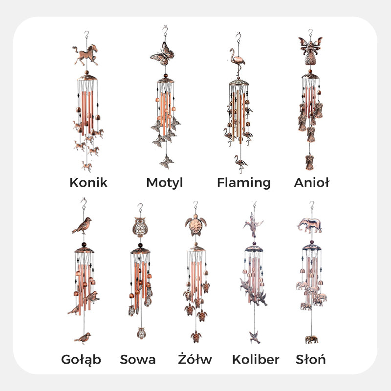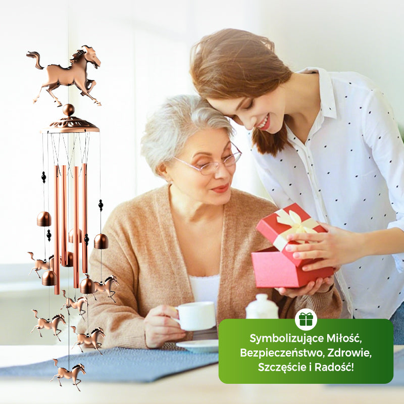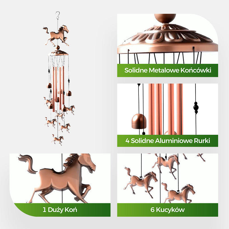 【UNIKALNY DESIGN】 Miedziany dzwonek wietrzny z koniem, wykonany ręcznie z solidnym metalowym zwieńczeniem, 4 solidnymi aluminiowymi rurkami, 6 małymi końmi i 1 dużym koniem. 6 żelaznych kul, z których każda ma swój własny charakterystyczny dźwięk, gdy metalowe rurki zderzają się ze sobą. Wykonany z aluminium, zapewnia piękny i harmonijny dźwięk oraz zapewnia czysty i przyjemny dźwięk w dowolnym miejscu. Kiedy wschodzi słońce, piękne promienie słoneczne odbijają się od dzwonka wiatrowego. Słuchanie pięknej muzyki na wietrze sprawia, że jesteś bardzo zrelaksowany i wygodny.