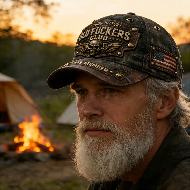 Solidne haftowane naszywki w stylu vintage — pochwal się swoimi osiągnięciami dzięki naszywkom z napisami „Old-School Club”, „100% Bitter” i „Lifetime Member”. Ta czapka jest oznaką honoru, symbolizującą dobrze przeżyte życie pełne bezkompromisowej surowości.