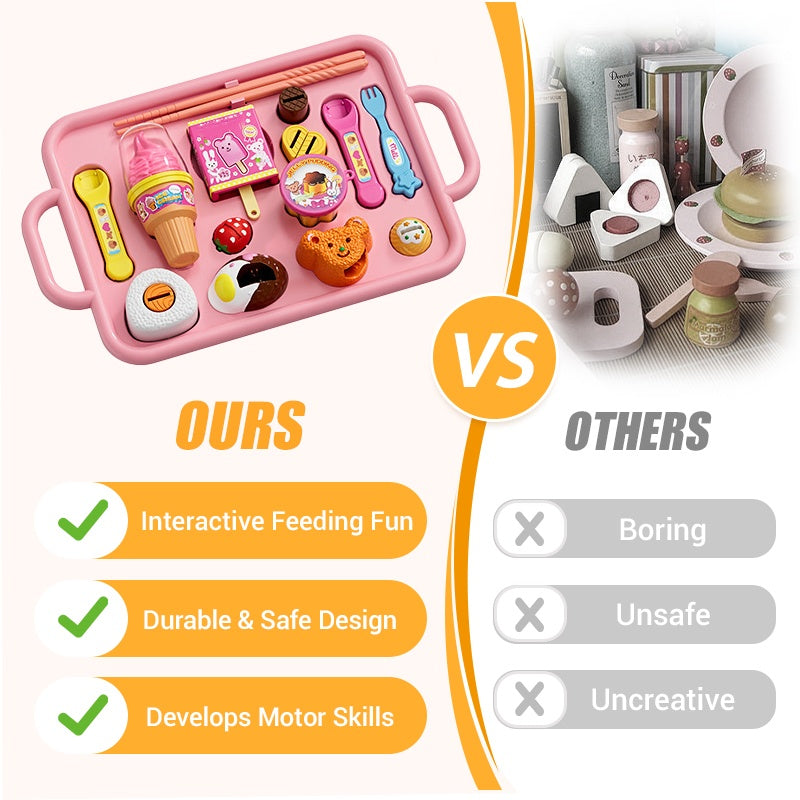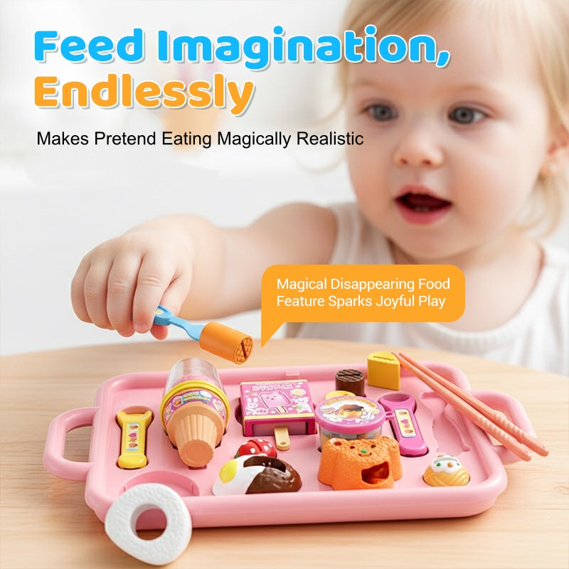 INTERAKTYWNA ZABAWA W KARMIONIE: Ta wyjątkowa konstrukcja pozwala dzieciom symulować karmienie i jedzenie, dzięki czemu zabawa staje się bardziej wciągająca. Jedzenie znika w naczyniu i można je wyjąć, co dodaje magii i pobudza wyobraźnię dzieci.