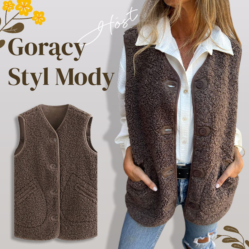 KAMIZELKA BEZ RĘKAWÓW: Ta stylowa kamizelka ma klasyczny krój bez rękawów w ponadczasowym jednolitym kolorze, wykonany z miękkiego, puszystego materiału. To idealny wybór na wczesną jesień, oferujący zarówno ciepło, jak i elegancję.